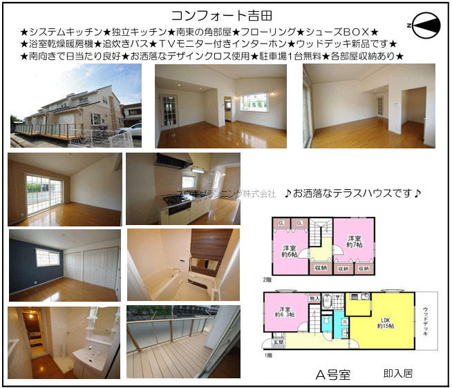 | 閑静な住宅街に建つ南向きで駐車場付のテラスハウスです。スーパー万代やコンビ二や郵便局等々全て徒歩5分圏内有り奥様のお買い物も安心です。 |