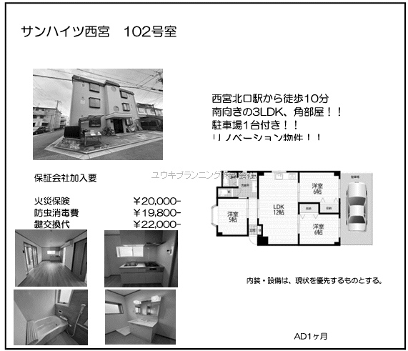 | 閑静な住宅街、駐車場有り、アクタ西宮徒歩4分等生活施設が全て徒歩4圏内に有りお忙しい貴方も安心です、人気の校区で子育ても安心です。 |