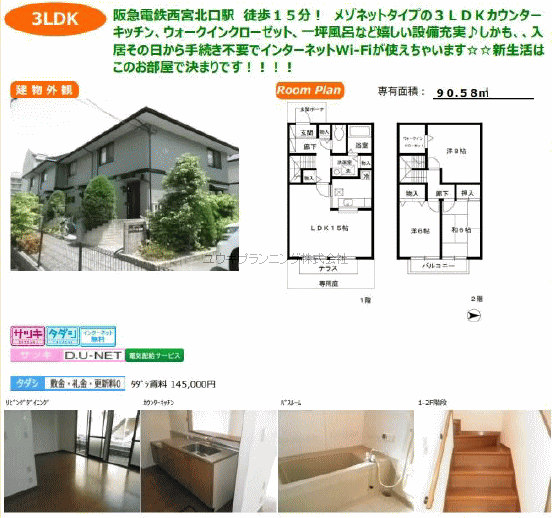 | メゾネットタイプ。靜住街。人気の高木小学校・瓦木中学校校区で子育て環境も良いですよ。コンビ二徒歩2分やダイエー西宮北口店徒歩5分等と奥様のお買い物も安心です。 |