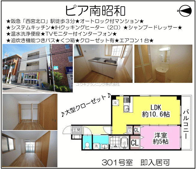 | 駅近!充実設備!閑静な住宅地!オートロック付です、女性の方も安心です。阪急西宮北口周辺には生活施設は全て揃っていますので生活面は心配無しです。 |