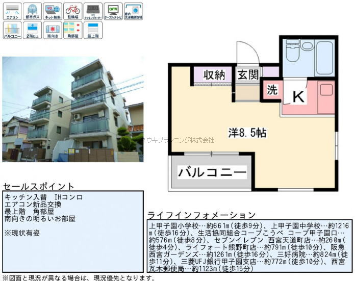 駅近!コンビニ徒歩5分生活便利!甲子園口の駅前には生活施設が全て揃っていますのではじめての一人暮らしでも心配無しです。上層階に付日当たり通風共に良好です。 |