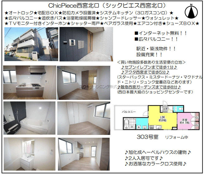 | 閑静な住宅街に建つコンクリート打ちっぱなしのデザイナーズマンションです。人気の鳴尾北小学校・学文中学校校区で子育て環境も良いですよ。お買い物もコープ徒歩7分等々生活便利です。 |