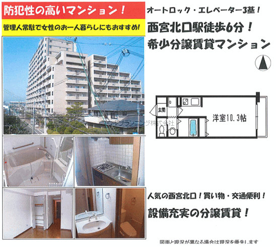 | 分譲貸、靜住街、阪急西宮ガーデンズ徒歩4分等々生活面は心配なしの好立地、関西学院生、神戸女学院生におすすめです。広々間取りのワンルームです。 |