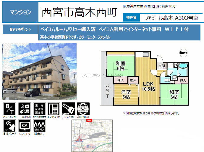 | 閑静な住宅街に建つ分譲貸マンションです。人気の高木小学校、瓦木中学校校区です。高木公園も徒歩2分たコンビニ徒歩4分ファミリーレストラン徒歩5分等々お子様の通学や奥様のお買い物も心配無しです。 |