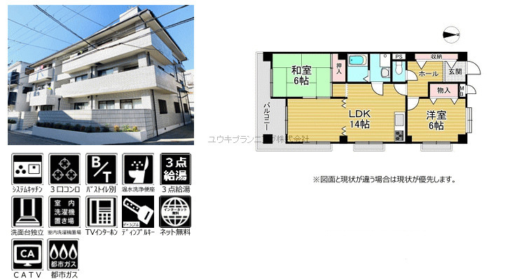 | 特色 | バストイレ別、室内洗濯機置場、収納、バルコニー、給湯器付、CATV |