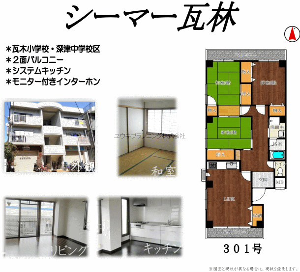 | 特色 | バストイレ別、室内洗濯機置場、バルコニー、駐車場、給湯器付、角部屋 |