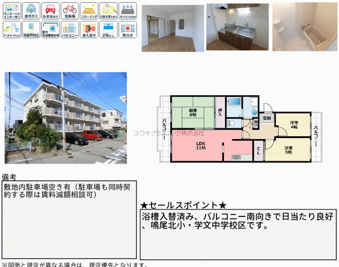 | 特色 | バストイレ別、室内洗濯機置場、バルコニー、駐車場、給湯器付 |
