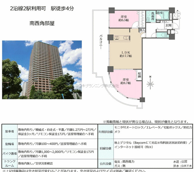| 特色 | バストイレ別、室内洗濯機置場、エアコン、エレベータ、オートロック、追焚バス、バルコニー、トランクルーム、CATV、インターネット対応、宅配ボックス、給湯器付、洋室、駐車場、角部屋 |