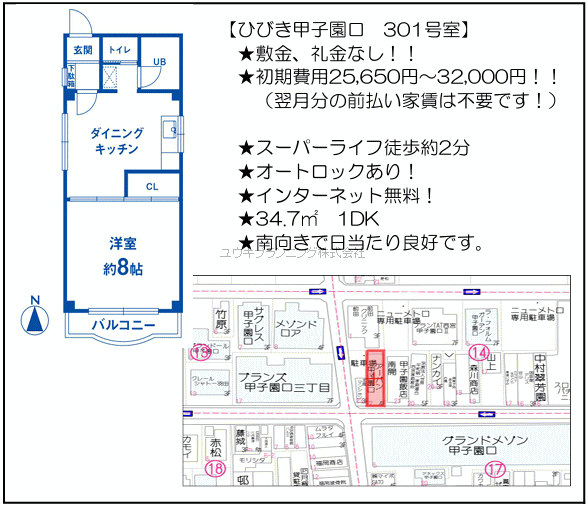 | 諸費用 | 家賃保証会社加入要 25,400円 鍵交換代 6,600円 クリーンシステム 30,000円 |
