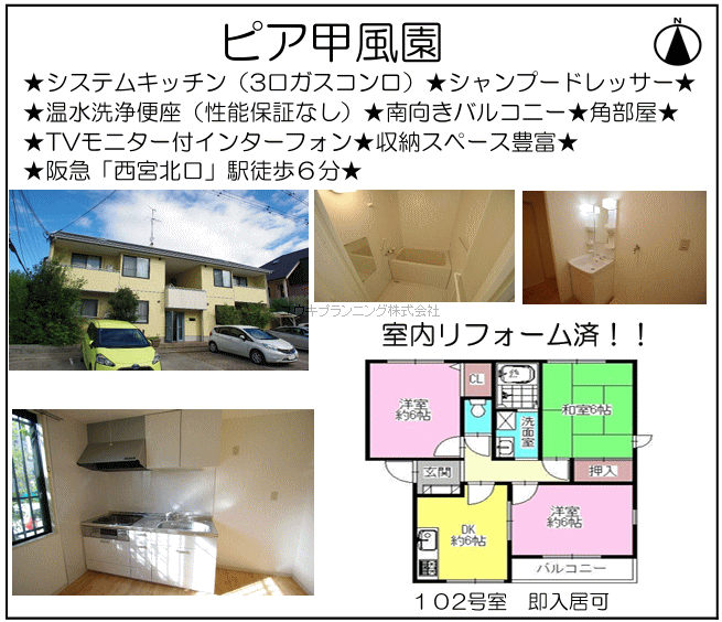 | コメント | 閑静な住宅街。阪急西宮北口駅前には徒歩5分圏内に生活施設が全て揃っていて奥様のお買い物も安心です。お手頃家賃で新婚様にもお奨め物件です。人気の高木小学校・瓦木中学校校区です。 |
