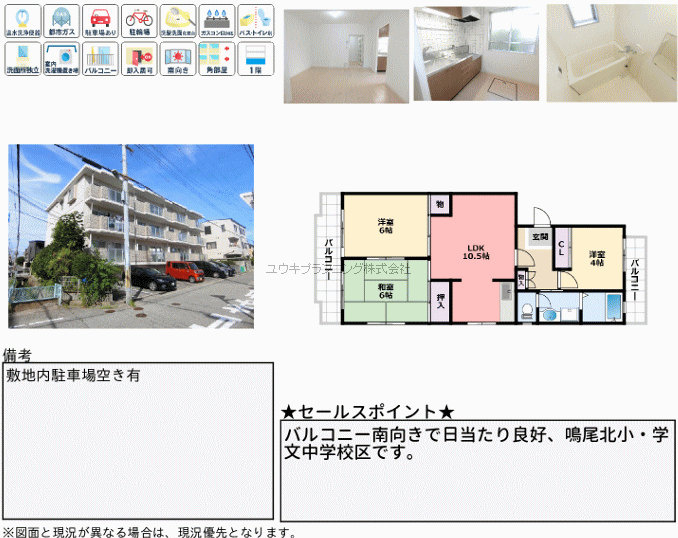 | 特色 | バストイレ別、室内洗濯機置場、バルコニー、駐車場、給湯器付 |