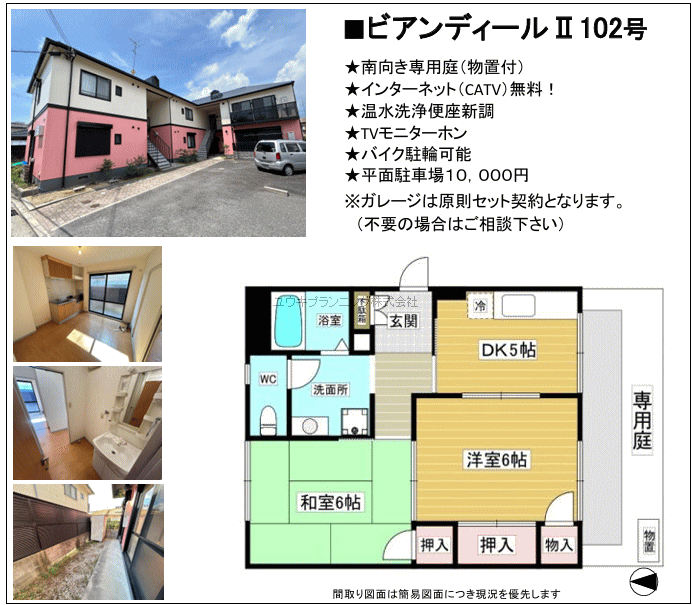 | 特色 | バストイレ別、室内洗濯機置場、バルコニー、給湯器付、駐車場、TV付インターホーン付、角部屋 |