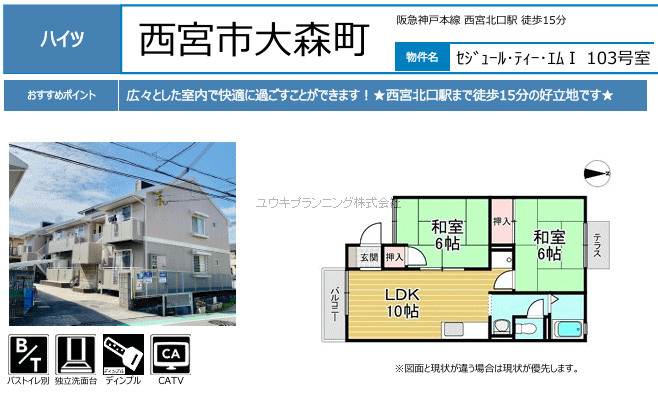 | 特色 | バストイレ別、ガスキッチン、室内洗濯機置場、収納、バルコニー、CATV、インターホン、BS、インターネット対応、給湯器付 |