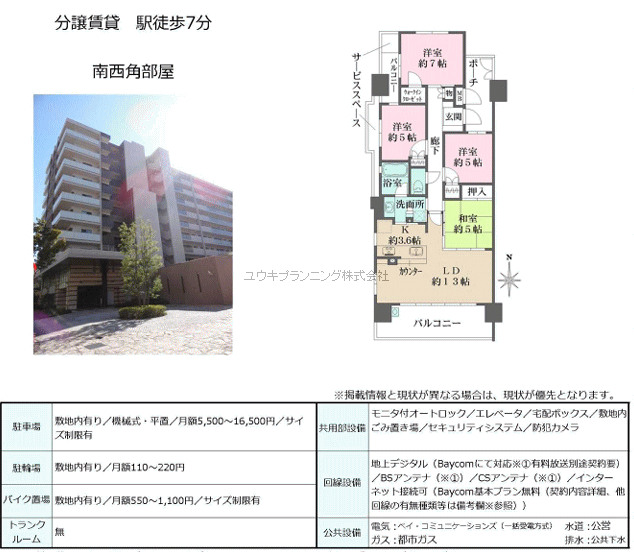 | 特色 | 角部屋、バストイレ別、室内洗濯機置場、収納、洋室、バルコニー、追焚バス、システムキッチン、宅配ボックス、インターネット対応、BS、オートロック、エレベータ、給湯器付、TV付インターホーン付、駐車場 |